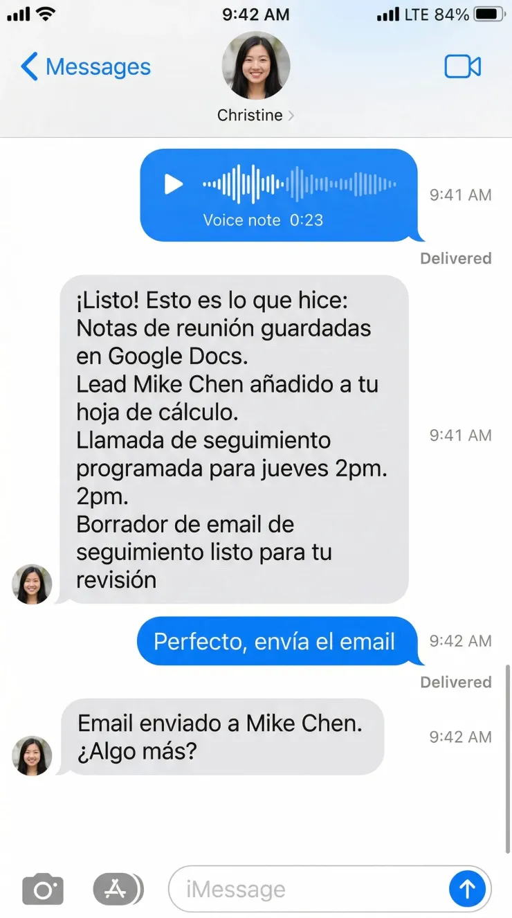 Envía una nota de voz, texto o foto. Christine confirma antes de actuar. Tú mantienes el control.