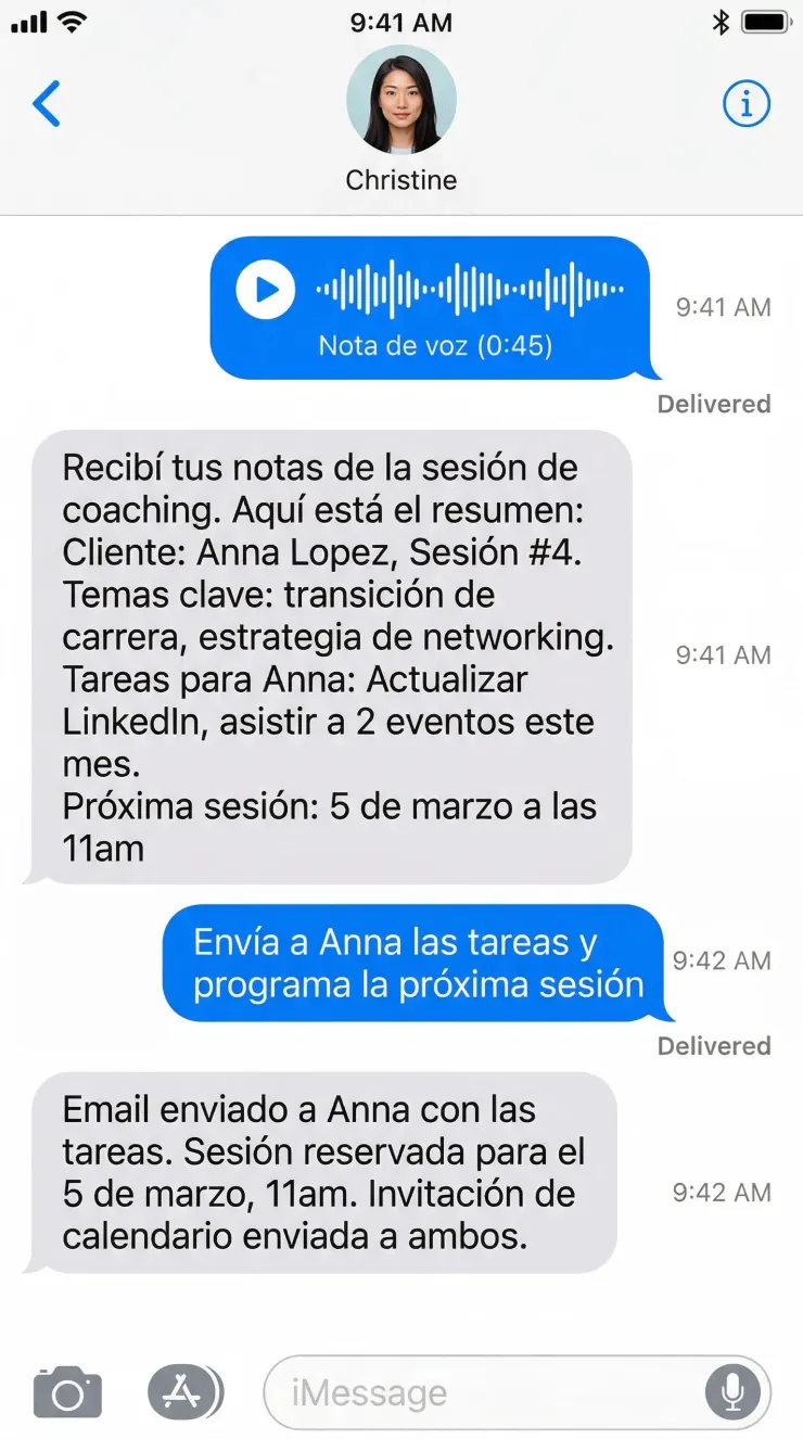 I have 18 active coaching clients. Before Christine, my session notes were always 2-3 days behind. Now I send a voice note after each session and the notes are done before my next client walks in.